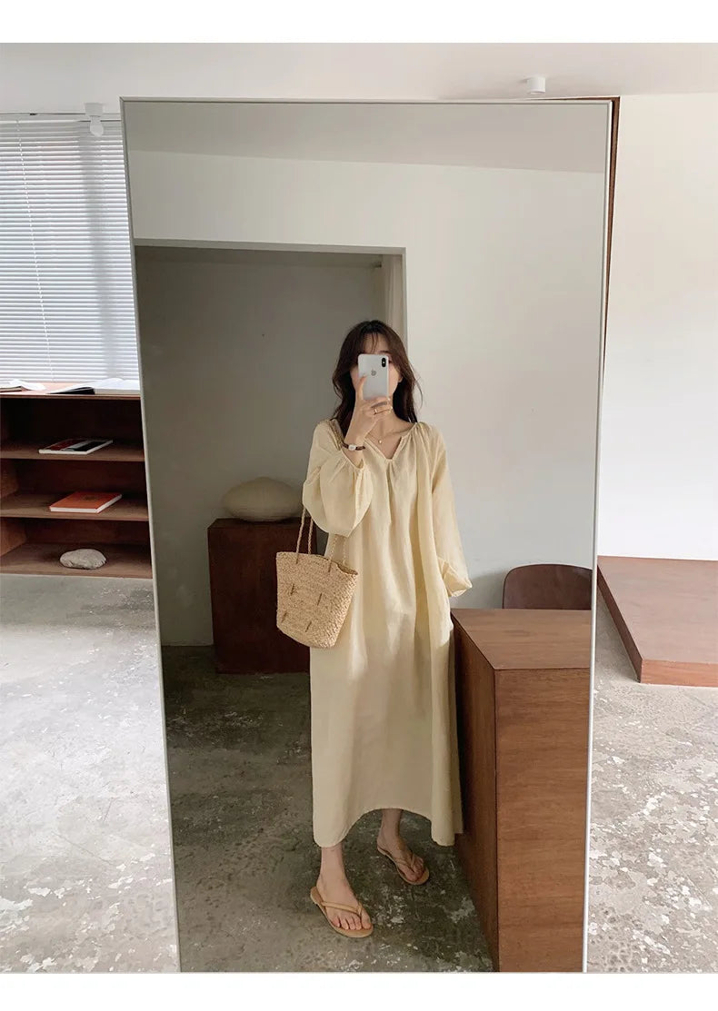 Vintage 100% Cotton V-Neck Loungewear Dress - Long Sleeve