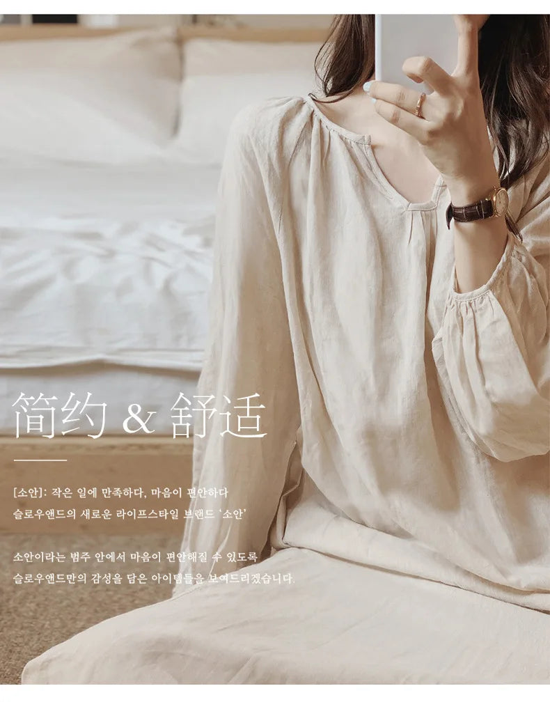 Embrace effortless elegance with this vintage-inspired pajama dress. Crafted from 100% breathable cotton crepe, this versatile piece transitions seamlessly from a cozy morning at home to a quick afternoon errand. Its loose, A-line silhouette offers freedom of movement, while the delicate V-neck and lantern sleeves add a touch of timeless style.